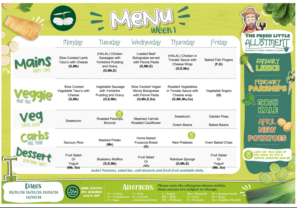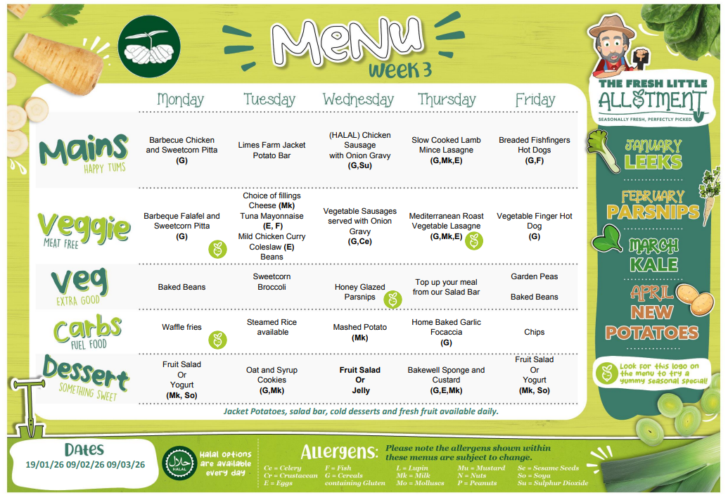 From Spring term 2026 the menu involves a three week rotating plan.